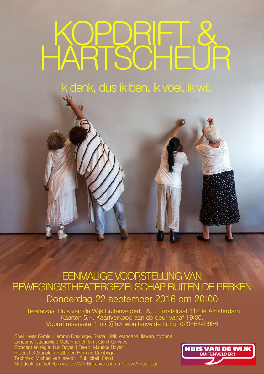 Boyer zette zijn kennis en ervaring in om relatief onervaren spelers kennis te laten maken met het podium. Het gelegenheidsgezelschap heeft zichzelf Bewegingstheatergroep Buiten de Perken genoemd. De groep bestaat uit ‘gezonde’ buurtbewoners en bewoners van Amstelring met NAH, oftewel Niet Aangeboren Hersenletsel, en in de naam van het gezelschap zitten verwijzingen naar beide: Buitenveldert en beperkingen – buiten de perken, ondanks beperkingen mooie dingen maken. Ook is bewust gekozen voor ‘bewegingstheatergroep’, beweging vormt voor het merendeel van de groepsleden een uitdaging. De voorstelling kwam tot stand door het samenbrengen van ieders ervaringen.